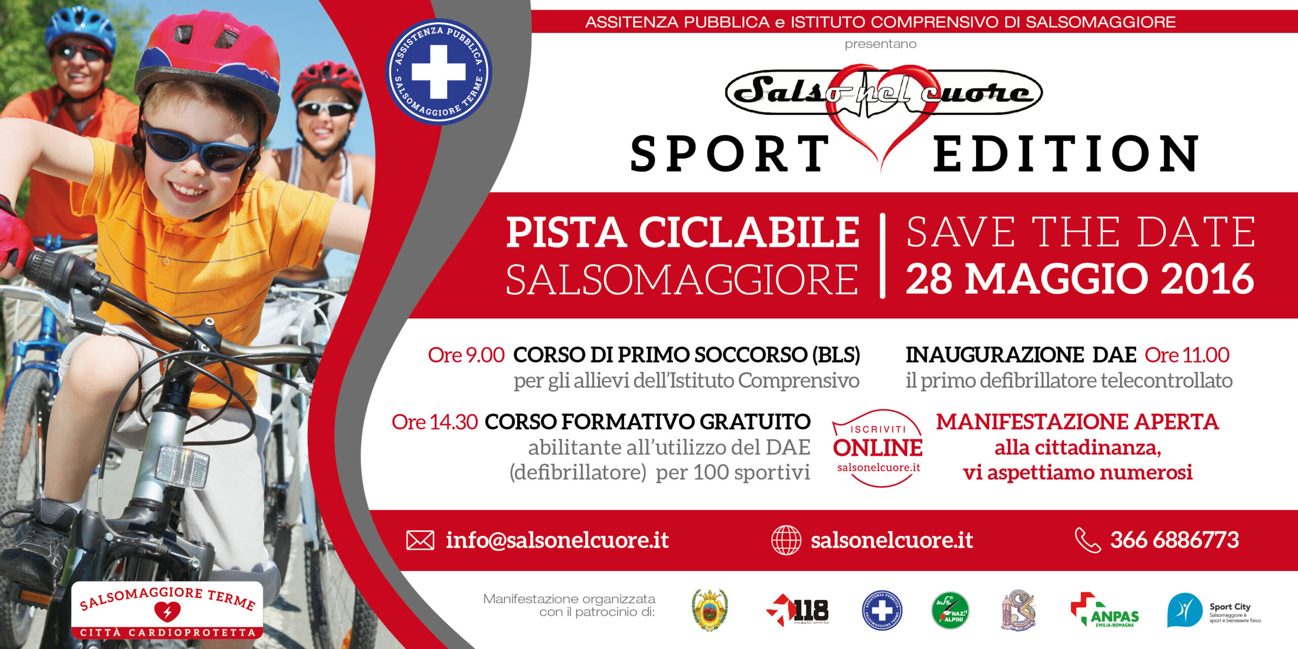 Nella giornata di Sabato 28 Maggio la Assistenza Pubblica di Salsomaggiore Terme , in collaborazione con Amministrazione Comunale e altre associazioni sul territorio , supportati dal Centro di Formazione ANPAS ER , nell’ambito del progetto SALSO NEL CUORE , procederà al posizionamento della venticinquesima postazione DAE del territorio . Nella giornata si terranno due sessioni didattiche dedicate alla formazione , rispettivamente , sul primo soccorso e Basic Life Support per studenti del locale Istituto Comprensivo e successivamente corso di abilitazione all’uso del Defibrillatore per 100 cittadini . Nel corso della giornata , all’ingresso delle principali arterie di accesso a Salsomaggiore Terme , già cittadina della Salute , verranno apposte le targhe identificative di “Città Cardio – protetta”.