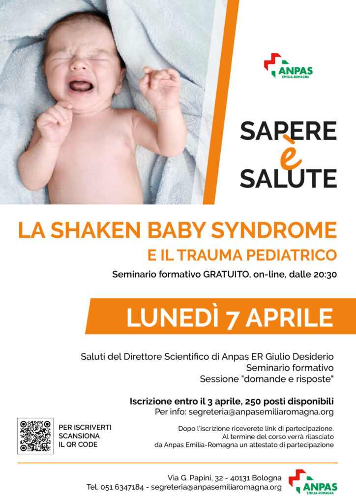 Shaken baby syndrome is a condition that is still relatively unknown outside the healthcare and emergency services sectors, but it has a significant incidence: between 16 and 38 cases per 100,000 infants. It is a syndrome linked to secondary behavior caused by stress and exasperation in some parents, who are often unaware of the serious trauma, even long-term, that they can cause their children. Now Anpas Emilia Romagna, a network of 109 public assistance organizations from all the provinces in the region, has organized an important online course open to everyone as part of the Sapere è Salute (Knowledge is Health) project, which promotes a series of information and training initiatives to increase the level of knowledge of adults and educators, primarily parents but also grandparents and other family members, about pediatric first aid. The online event is scheduled for Monday, April 7, at 8:30 p.m. You can register using the form at https://forms.gle/BKHUFzGXEY3UhxP1A, which can also be easily accessed through the Anpas Emilia Romagna Facebook page. Once registered, you will receive a link to participate in the course, and at the end, you will receive a certificate of participation. The training evening will feature a presentation by Giulio Desiderio, Scientific Director of Anpas Emilia Romagna, and an interactive question and answer session with participants. The event is limited to 250 participants, so be sure to register soon.